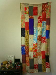 While I was hunting around for glamorous pictures of myself to show the world (to no avail), I found this photo of a kimono patchwork throw that I made for another friend’s wedding a few years ago while I was still living in Tokyo. I pinned it to my wall to get a photo of it before it left my hands, and now I’m getting all nostalgic about my little crappy flat where I lived for 4 years…it’s hard to see in this pic but next to the patchwork is a Japanese wooden set of drawers with an assortment of flea market treasures on it. I love feeling like I’m living in an antique shop and the crazy juxtaposition of crap that would be totally worthless to anyone else. I’m living in a crazy juxtaposition of crap at the moment too, but it’s not as photogenic, mainly because there’s hardly a patch of floor to stand on from which to take a photo.