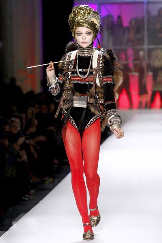 (Later): When I wrote this post I had not yet viewed the Jean Paul Gaultier show. I’m usually not a big fan, but I must be obsessed with legwear or something at the moment. Wouldn’t you be if your socks could look like this? They look like the work of some seriously creative (or bored) Bavarian hausfrau who was commissioned to create legwear for a giraffe. Actually, I’m sure that was the design brief that Monsieur Gaultier issued to his knitwits.