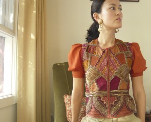 Many months ago fate was kind to me at one of my favourite op shops. Just as I was about to leave empty handed, one of the staff started bringing stuff out from the back room to be hung on racks around the store… and that’s when I, like an eagle with a sixth sense for traditional costumes, swooped… it must have been “clean out your wardrobe” week in various multicultural communities, as I found an Indian top with embroidery and sequins all over the front and lacing up the back (which I removed before thinking of taking this photo and was too lazy to put back in) as well as a red embroidered dress which I think is Afghan and will definitely be appearing in a later post, once I fix it… and they were both only something like $7 (which, admittedly is a bit expensive by my standards, but I’m a sucker for embroidery and beading work and anything ethnic-ky). It’s taken me ages to finally get around to altering the Indian top but after a lot of seam-shifting (no cutting involved) and trying to get the sleeves to look right, I came up with this. Not my bes