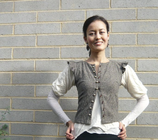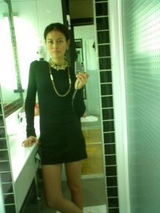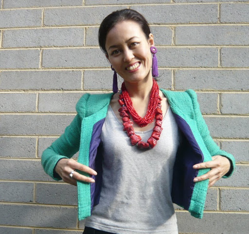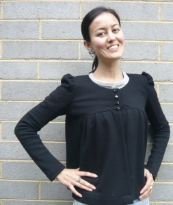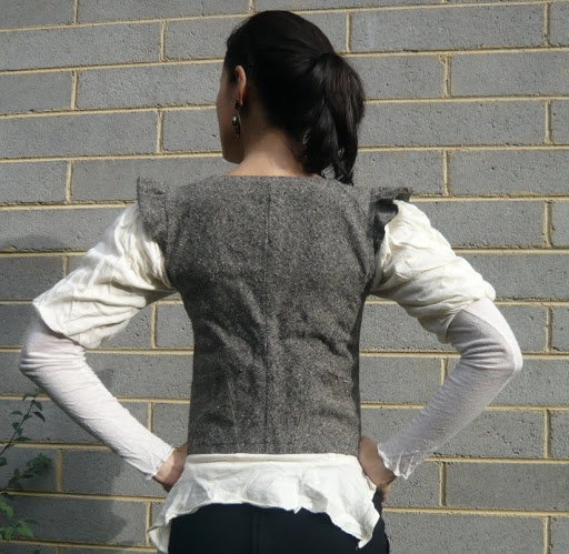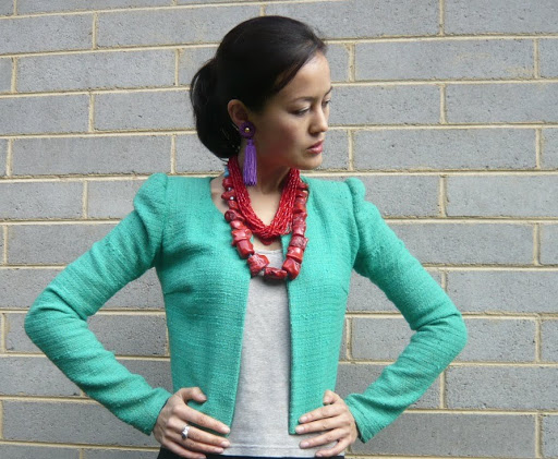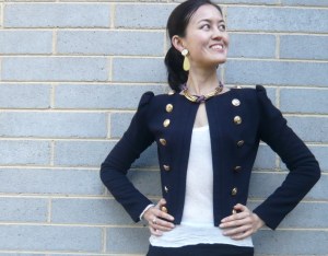 Recently I accepted a writing brief about signature pieces which made me think a little, as I didn’t think that I had a signature piece, personally. But even though I may not have one particular piece I’d think of as a signature piece, I do wear these jackets ALL THE TIME, and they’re all made from the one pattern (which was drafted with a lot of help from a clever ex). So far I’ve used it to make this green jacket with purple lining, a navy marine-inspired wool one with gold buttons, a tweedy brown vest with little frills at the shoulders, and a black wool jersey baby-doll style jacket, plus a very fitted dress from the same material which you can also see here (and which I could not be bothered squeezing into to photograph when I took these shots yesterday). I wear the green one the most, I love the colour and the tweedy green Chanel-like fabric, I designed it with the purple lining because the colour combination and the very narrow sleeves somehow reminded me of the stereotypical colours used for make-up on tomb paintings and so on in Ancient Egypt and I was trying to do an Egyptian collection… the collection did not eventuate but I still scored the jacket pattern, which I think is not too bad when I’ve used it this many times… and there’s another one in the making which I will post about when it’s done. It’s purple! And it has leather fringing! And it cost about $5 all together! Now if that’s not something to get excited about, I don’t know what is. In fact I shouldn’t have started posting about it just before I go to bed, because how on earth am I going to get to sleep now!? Anyway, what do you think your signature piece is… or your favourite sewing pattern, for that matter? What is it that makes you instantly recognisable across a crowded room – apart from your amazing beauty, that is 🙂 ?