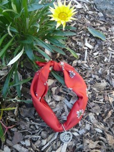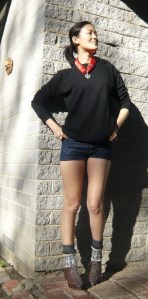 this scarf with an edelweiss* pattern and pendant. It gives the black top a lift too. (It’s a size XL thermal wool top that I got from the Salvos). Ideally, rather than these shorts (cut-offs made from 18th Amendment jeans samples) I’d be wearing cute little suede bib and brace lederhosen in a sort of olivey colour to give off a more authentic vibe but, well, unlike sporrans, lederhosen are in short supply at my local op shop so you’ll just have to imagine them instead.