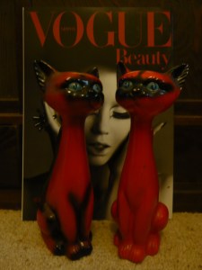 Retro-kitschy red porcelain cats from an op shop with a Japanese Vogue beauty supplement as the backdrop.