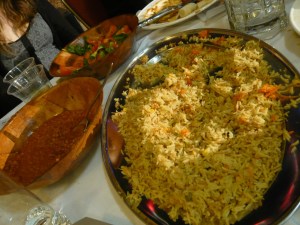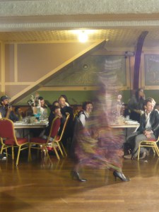 I know I gave you a preview of my dress the other day but here’s another pic showing me looking decidedly more relaxed than I was actually getting to the event… I’m a real wuss when it comes to driving and it was the first time I’d driven to Collingwood… AND it was raining AND I hadn’t noticed the road I planned to park in was a no-through road AND I had to walk in heels… whinge, whinge, whinge… anyway I found my table and sat down next to Lou, my Peppermint cohort who had kindly invited me to the evening and was looking extremely happy about the delicious dinner that was being served, as were we all…(several comments were made about wishing we’d brought doggie bags, which is of course the ultimate – and most sophisticated – compliment one can pay about a meal…)
