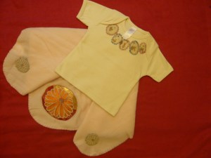 I decorated some organic cotton T-shirts with kimono scraps a while ago and have a little stockpile which is gradually disappearing as the baby population grows… I also decorated a bunny rug with some applique from a vintage obi for a baby girl recently…maybe a bit hard to see properly in this photo, but the pale pink rug is folded and the T-shirt is sitting on top of it.