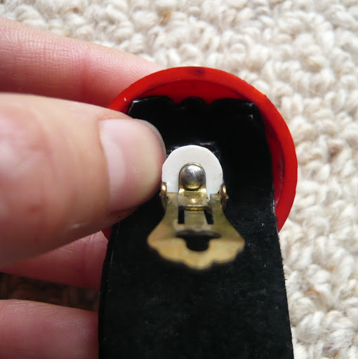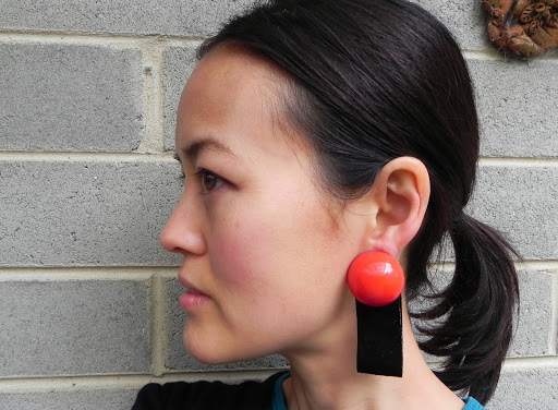 I found these earrings for about $1 at an op shop (I buy practically all of my earrings second hand because I can hardly ever find clip-ons new) and I got the leather from my local market – if there’s a stall selling leather jackets at yours, you can probably ask the seller if they have any scraps. I got a whole lot of coloured leather* for $2 per piece… I’d estimate the amount of leather (suede, actually) used in this project cost about 20c all together!!