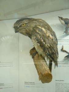 Having visited many times before I know that there are tawny frogmouths in the forest if you bother looking around for them, but I had a bit of a laugh at a sign saying ‘look up’ – the bird was sleeping practically directly above the sign, it must particularly like that spot. I couldn’t get a proper shot as it was up too high but this is what a tawny frogmouth looks like when it’s awake (there was one in the taxidermied section).