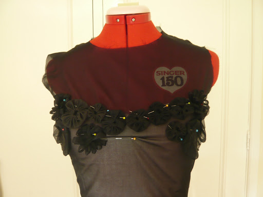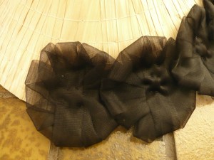 It would have looked very simple with no decoration, and I had to do something to give me the appearance of having feminine attributes, so at strategic points I added yo-yos made of kimono material as well as daisies and flat pom-pom-like things made out of nylon ribbon that was $1 from an op shop. (cost = about $2 .. probably not even that much as the kimono material was scrap and I did not even use a quarter of the ribbon).