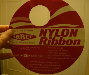 I have a lot of the nylon ribbon left over so will most likely be using it in future projects. I have a feeling it is rather old… its selling point is that you can make “warm tea cosies, fashionable handbags, natty coat hangers, soft luxurious bathmats… and … lampshade coverings”. NATTY coat hangers??! Tea cosies? I’m reckoning that it might be from about the 70s at the very latest, unless it is made by a craft company whose marketing department carries on in blissful ignorance of current trends!