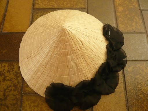 I also used the flat pom-pom things to decorate this Asian rice farmer’s hat which my sister gave me. I cut about 6cm of the brim off, sewed the pom-pom things on, and made a hair tie and a hatband out of dark pink kimono fabric and elastic which was fairly ineffectual in the wind (refer to previous post to witness my embarrassment). (cost = maybe 50c all together).