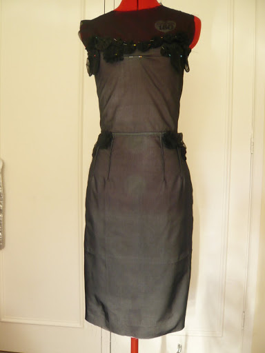 Fortunately several months ago I bought a package of several kinds of black material at an op shop for $5, included in which was this black chiffon-y sort of stuff. I’m not a chiffon-y sort of girl but I had to use what was at hand, so dreamed up a 50s style wiggle dress. Not that I have anything to wiggle (more on that later). (cost = about $1 as I did not use all the material)