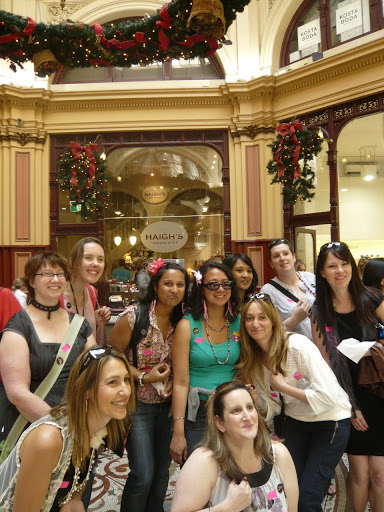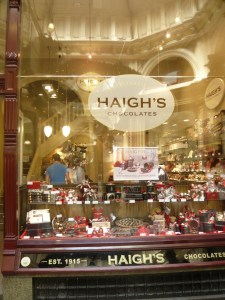 One of my friends is a food fiend. In fact, most of my friends are food fiends and so our social activities revolve around cooking and eating, although my skills do not really lie in the cooking department so I prefer to deal only in the eating part. Anyway, this particular friend is getting married in a few weeks and this weekend was her hen’s night. But one night is not enough time to fit in much serious eating, so it was decided that an afternoon chocolate tour would be the best way to start celebrations. We gathered in Melbourne’s Block Arcade which is home to one of chocolate’s meccas, Haigh’s.