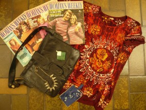 Woman’s Weekly magazines from the 1970s, $1 each, a leather bag for $3 and cheap jewellery from the same stall, which the lady put in a cute little navy silk pouch for me, plus a 70s batik Tshirt which is very similar to this one and makes me feel all groovy, man (thank you, Photo Booth, for turning me into an honorary hippy).