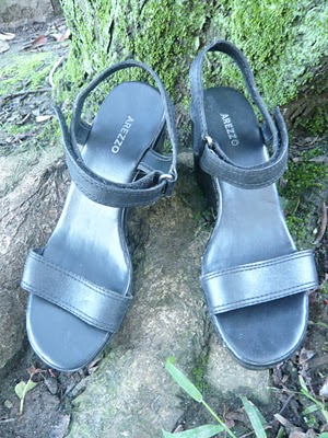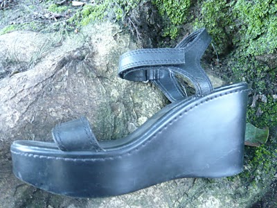 Black, velcro straps and platform heels dates these as most likely being a product of the mid 90s. As they were slightly too loose and also too boring to wear as-is, they lay untouched in my “things to fiddle with” pile, which is basically stuff that is too good to throw out and about which I intend to have an epiphany as regards how I should lengthen/shorten/embellish/simplify/completely remodel it. But then, for another project, I bought some leather and suede scraps, and a light went on in my brain. I cut some black suede into long strips and wrapped them around the front strap and the heel strap, securing it with a little bit of superglue.