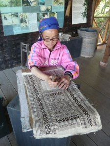 The proper versions of these skirts take something like six months to make if they are made the traditional way, as home-grown, home-spun, home-woven cotton (or hemp?) is painstakingly decorated with batik patterns using tree resin and charcoal, dyed over and over again in home-made indigo solution, pleated and embroidered, all by hand. Whew, I’m exhausted just thinking about that as I spent one afternoon in Laos learning batik and ended up with a rectangle of about 30 x 60cm – and that was just drawing the pattern on, we didn’t even dye it once. (Here’s the lady who patiently taught me how to do it, she drew that intricate pattern completely freehand. Amazing.)