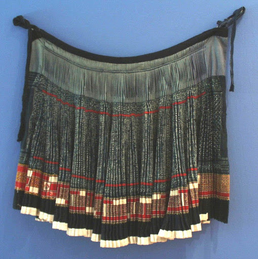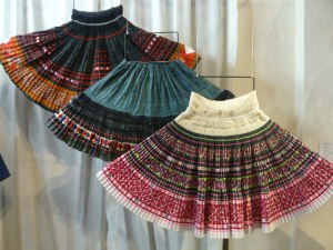 Yes, a few years ago. Like many of my projects, it has sat around waiting for me to work out what to do with it for way too long. Turns out it really didn’t need much done to it at all. Originally it was a wrap skirt with a tie, you’ve probably seen this sort of thing if you’ve ever been to Thailand, Laos or Vietnam as the Hmong and hill tribe people often sell them in the markets. It looked sort of like this (I cut into it ages ago without taking a photo first, but here are some similar skirts at a costume museum in Luang Prabang).