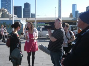 Amazingly, I managed to show self-restraint and walked away from the market with nothing but a handful of business cards from all the lovely ladies who I’ve featured here. My friend Jun and I walked and trammed to Federation Square to catch the Viva multicultural festival. Before we’d even set foot into the main part of the square we were stopped by a film crew from channel 31 who were asking people what they thought of the festival and multiculturalism in Melbourne.