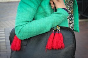 Tassels on my bag – maybe $2 or so each, from Laos (more about tassels and my trip here). They’ve been sitting in a drawer since I got back, as I wasn’t really sure what to do with them, but I think they look perfect on this bag! A guy from Grazia magazine even came up and took shots of them (I don’t think they got used in the magazine though).