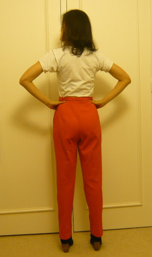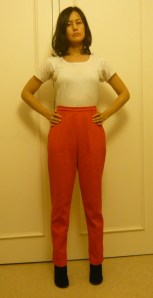 I recently posted about a denim skirt that I got at Camberwell market in a scoop of dead stock bargains (and no, I still haven’t had time to dye it, aggh!). I also found these brilliantly red pants, which required no dyeing, but a fair bit of altering. I don’t think I have to explain why. Here are the extremely glamorous “before” pics!