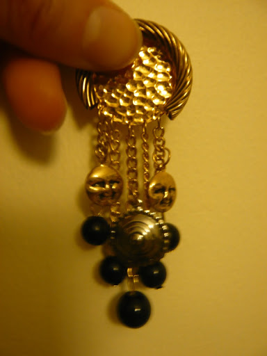 The gold and blue earrings on the left are a mix of two different pairs – the top gold part are basic clip-ons and the dangly blue balls (stop sniggering) are from a pair of pierced earrings which I can’t wear thanks to being too wussy to get holes in my ears. Total cost – about $2 (the clip-on bits were a present from my sister so I only had to buy the dangly blue balls (cut the sniggering out now!)).