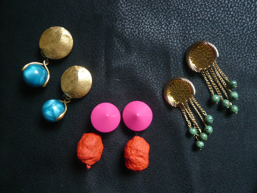Actually, the pair in the middle are the only ones I made this weekend, and they only took a few minutes to put together. The pink parts are clip-on earrings and the dangly bits are papier mache beads which I made ages ago from newspaper and painted red. I intend to experiment a lot more with papier mache as it’s basically free to make and very lightweight even though it looks so chunky. If these dangly bits were real stones or clay then my earlobes would be dragging on the ground by now! Total cost of this pair – maybe $1? I’m not counting the cost of the many hours I spent covered in flour and bits of soggy newspaper trying to make papier mache…