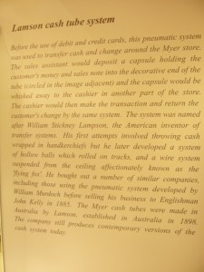 I took a photo of the explanation of how this pneumatic system works – hope you can read it? I had a giggle thinking of Mr Lampson’s first attempts at a transfer system involving throwing cash wrapped in handkerchiefs around the shop… slight OHS issue? What if you’re crap at throwing and catching like myself?? Potential for a LOT of humour but a LOT of injuries too…