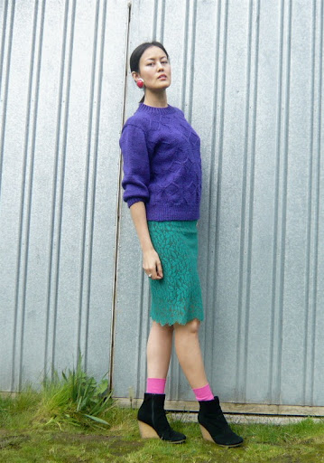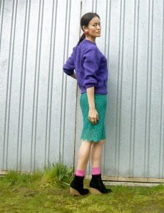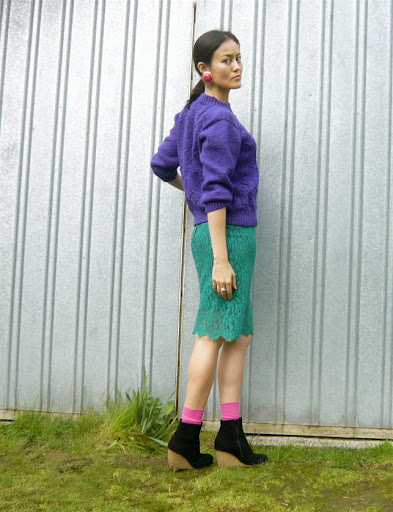 I’m running a stall at Southside Handmade and Vintage market this weekend so was sorting out what to take from my wardrobe when I found this lace skirt (originally found at a flea market or op shop in Japan for $1, if I recall correctly). I was tossing up whether to sell it but I think the emerald green looks amazing with the indigo of the jumper, so looks like it’s staying! And I’ll even keep these bright pink socks (which happen to be from 1986… I always saved them for “best”, but as I never went anywhere that special, they’re still in fairly much new condition).