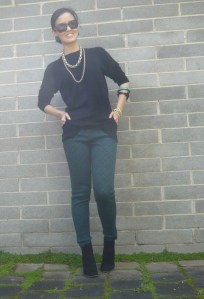 Yes, I should have taken a “before” photo of me wearing them but of course I didn’t think of that. Basically all I did to them was take them in along the sides and let down the hems (which turned out to be rib-finished, yay!) and then I added pockets for a bit of detail at the front. I wanted to use leather but then I actually thought about it (rare, rare event) and realised that would mean I couldn’t just chuck them in the washing machine. So the pockets are made from bits of an old jumper instead.