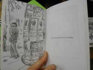 Here’s his cartoon of a guy on his mobile on Swanston Street saying “Can I call you back? I’m in a meeting”…