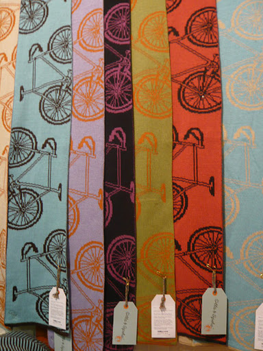 Bike-themed scarves by Otto and Spike, a firm that makes knitwear the old fashioned way.