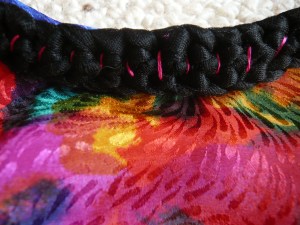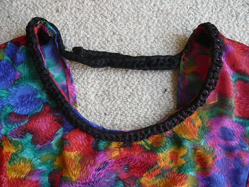 Well, actually, it’s obvious that I’d already finished the neckline, but it looks like I’m thinking, doesn’t it. Yes, that’s my thinking face. Anyway, what I ended up doing was cutting a little bit more off the neckline after removing the collar, then making a double-crochet strip from some nylon ribbon (also from an op shop and used previously to decorate my Spring Racing Carnival outfit) and attaching it with big colourful embroidery thread stitches across the front (ie, what used to be the back).