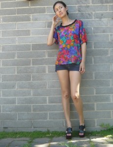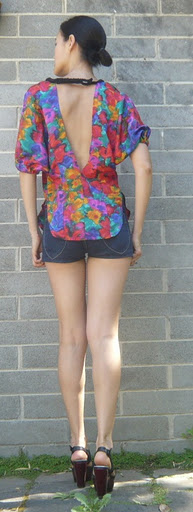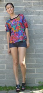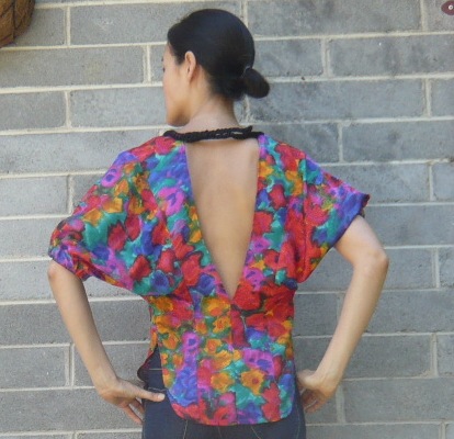As it’s not that easy to find shawl-collared colourful tops in every op shop, I didn’t bother doing this re-fashion post as a step-by-step tutorial, but I think there are some ideas in here which you could use easily in other projects – like the crochet trim (it’s easy to make a braid if you can’t crochet), the open back and hemline that rises at the sides (you could cut a T-shirt top to achieve a similar look), puff sleeves (doable with just about any top that has loose sleeves) and (with a bit of inspiration from Kris Kross) – wearing things back to front!