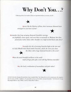 Although some of the suggestions are a bit irrelevant today (such as using a zip on an evening dress – something we take for granted now but was revolutionary in the 1930s) or somewhat impractical unless you’re rolling in money (asking your personal jeweller to use the diamonds you just happen to have lying around to create wearable accessories, using flat Champagne to wash a blonde child’s hair), there is still plenty to inspire.