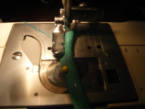 I made some thickish piping from green bias binding and cord that I had lying around and inserted it into the shoulder seam. This did not work as well as planned as the binding wasn’t really wide enough for the cord, but here’s how I did it: