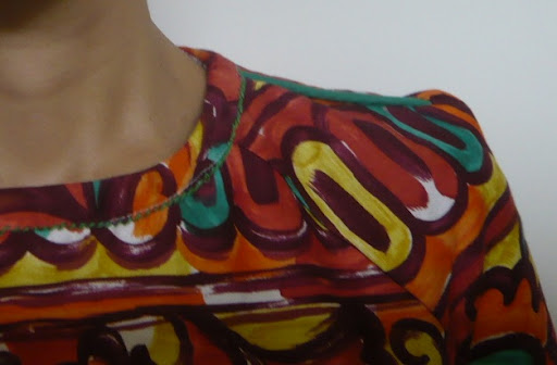 It’s a pretty simple pattern with raglan sleeves and with such a loud painted-looking pattern I’m fairly sure most people would have left it at that. But where would have been the fun in just whipping up a dress and not adding anything to it? So I decided to stitch around the neckline in green and also use some of my ample supply of bias binding to add a bit of interest (that probably no one but myself will notice).
