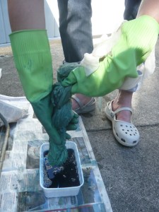 We experimented with a few other bits of clothing before doing the dress, but I will show you those in another post. Here’s Georgia dyeing the dress – she twisted it quite tightly and dipped it in the vat very carefully before lifting it out slowly and letting it drip into another container. If you let the item you’re dyeing drip into the vat, too much oxygen gets into the solution and the dye stops working. The dye is really like a living thing and has to be treated with a healthy amount of respect!