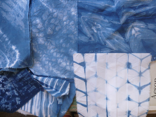But Lisa didn’t just take it home and hang in her (amply stocked!) wardrobe. The point of Georgia’s project was to make some dresses which would be worn once, then altered for the next wearer. I was the next wearer for Lisa’s dress, and as Georgia had told me about an indigo dyeing workshop she’d been doing, we decided to see how the dress would turn out if we tie dyed it. Here are some samples that Georgia did at the workshop – isn’t it cool, all the different effects that can be achieved just by scrunching, twisting or folding between planks.