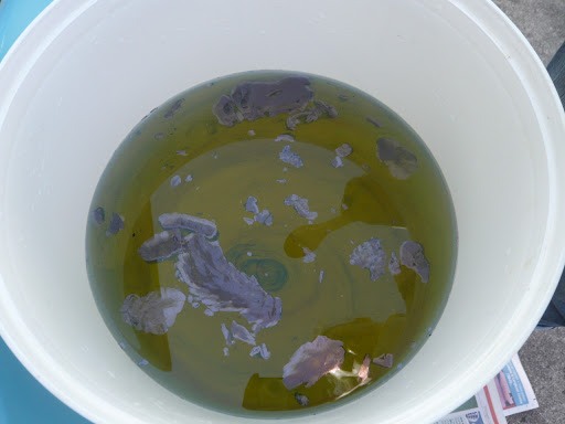 This is the dye bath… Georgia took a little while to get it ready as it’s a little bit tricky adding the chemicals (the indigo itself is organic but she still had to add a few things).