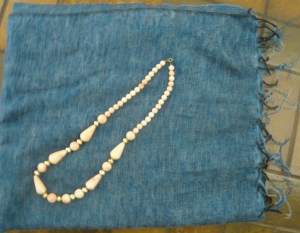 This blue scarf made from yak wool is also from Seven Women. It’s not quite chilly enough to use it yet, but it won’t be long. And the necklace is vintage, a gift from a lady after my own heart when it comes to making statements with accessories…