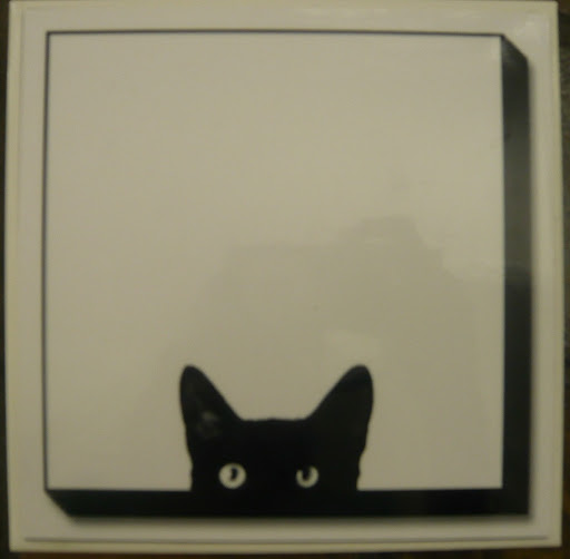 If you’re a good photographer or have graphic skillz such as I do not possess (yes, this blog is WAY overdue for a makeover, I am aware!), this super cute tile might give you some ideas. The graphic of the cat has somehow been printed onto the tile and there’s a hook at the back to hang it up, or you can just lean it against a wall and … LOOK INTO ITS EYES…