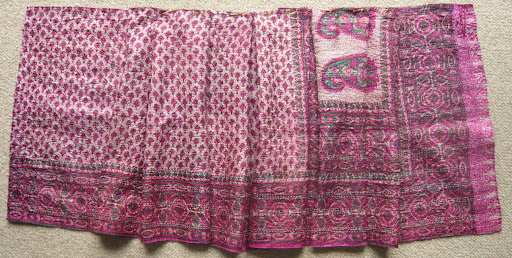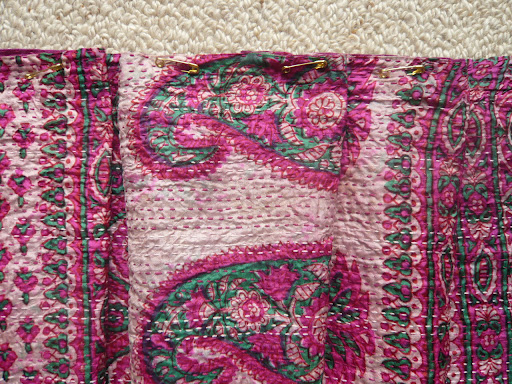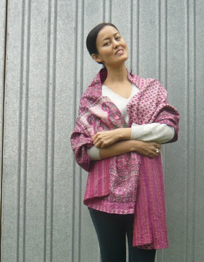 I didn’t take pics of me wrapping and pinning the shawl on myself as I simply don’t have enough hands, so hopefully you can understand what I did – really I just left about 20cm at the ends of the shawl free, but made large folds (ie pleats) randomly along the length and fastened them with safety pins (you can see the kantha stitching running across the shawl too in this close-up pic!).