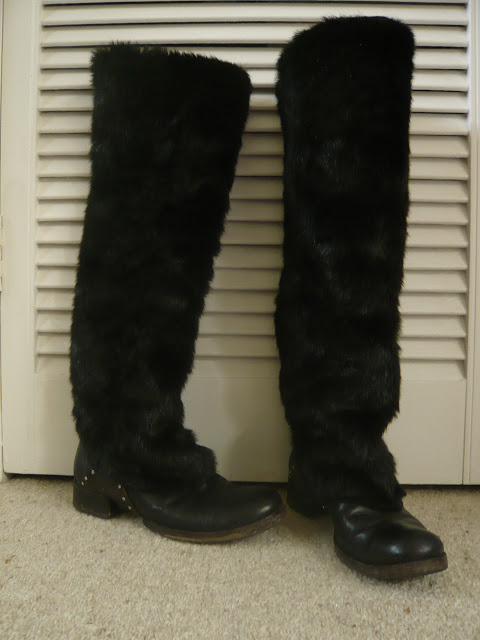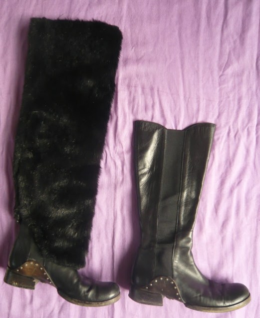 They’re from a Salvos store and were only about $10, although I paid $40 at a shoe repair place for the back seams to be repaired. It turns out, though, that they are very close fitting around the calves, which makes my stick-figure legs look even more stick-figurey. See what the boots look like without the legwarmers?