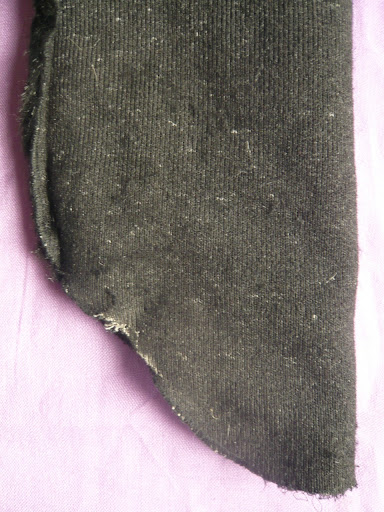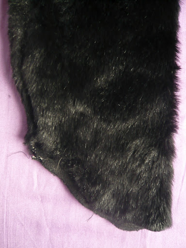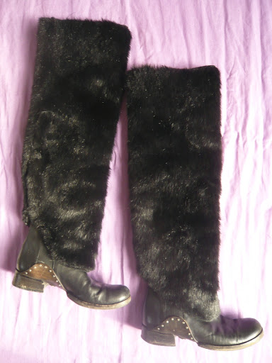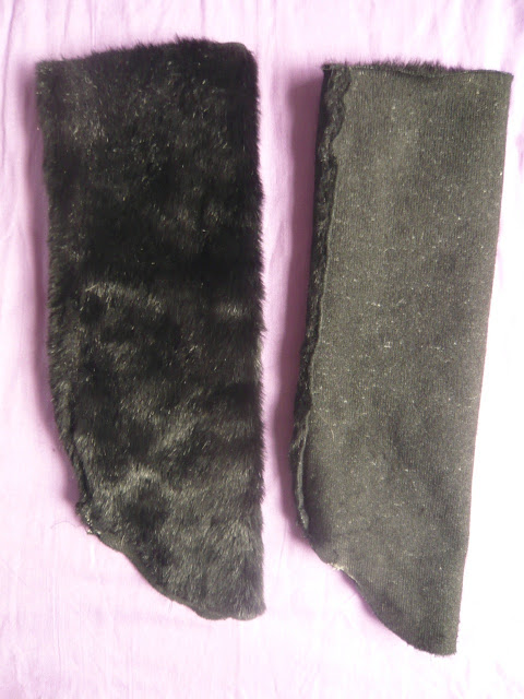 They’re also a little bit shorter than I’d like, so not only do these furry legwarmers make my legs toasty, they also add texture and, more importantly, flattering length and volume. They’re super easy to make, so if you have some fake fur (or leather, or even canvas) lying around, why not give them a go? Here’s what they look like when laid flat (the one on the right is turned inside out).