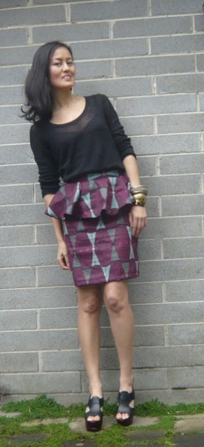 You might remember I mentioned I have been doing a patternmaking course which involved us drafting a basic skirt based on our own measurements. We were meant to make it in plain calico, but you can guess what I thought about that idea. Why use plain fabric when you could use print? Anyway, the basic skirt looks like this – quite appropriate even for office wear, as my geek-girl glasses are meant to be indicating.