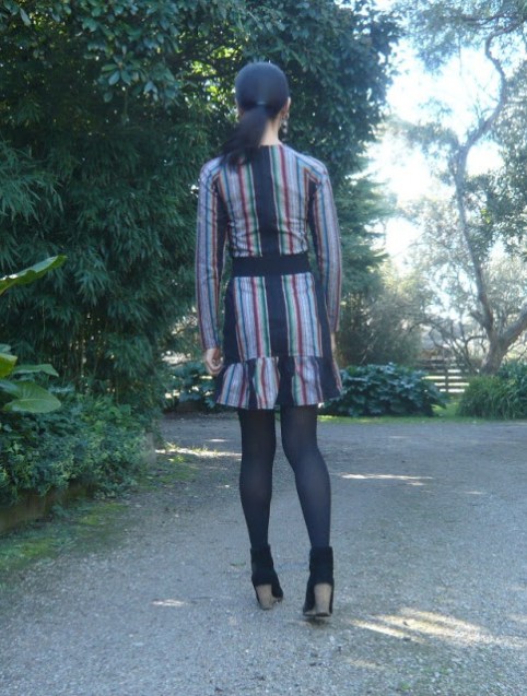 Of course if I’d had the luxury of more material I would have experimented with the stripes a bit more – there’s a lot of potential for creating illusions with stripes. I could have created a dress that made me look like I have a waist, for instance. Oh well, next time! This post is all about making do, after all, so I’ll create a waist with a belt for now.