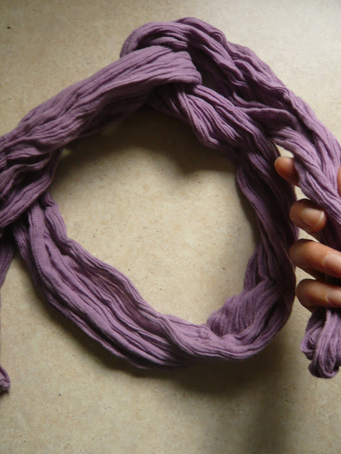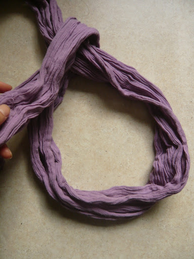 It was very easy to make this – even easier if you don’t have to join scraps of material first! You can do it with any scarf that is long enough to easily go around your head, like so: Bring both lengths together in the middle above your head…