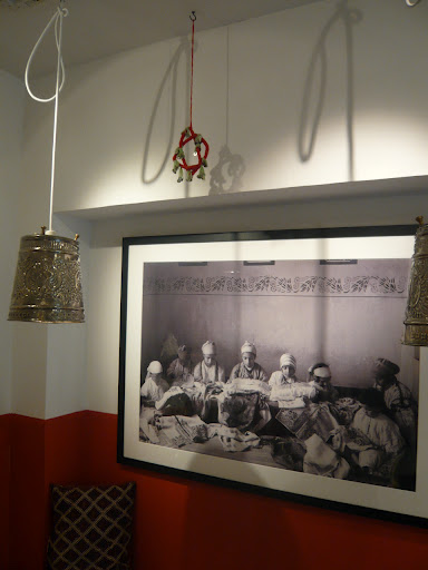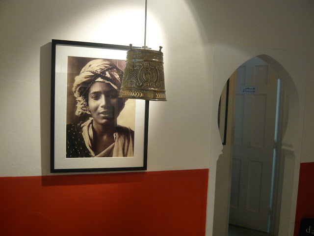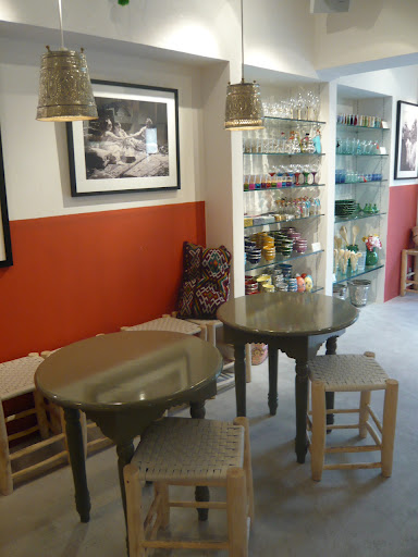 There is a little cafe in the shop too which serves things like Moroccan mint tea. I love the simple decorations – pressed silver lampshades, half-coloured walls, black and white photos, embroidered cushions…