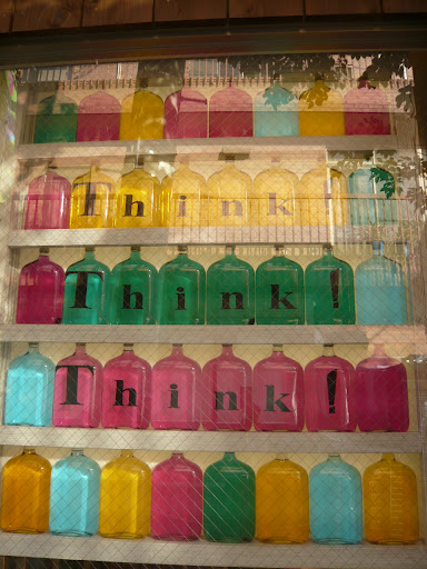 Bottles saying “Think!” (instead of “Drink!”?) at a shoe shop by the same name (Think!).