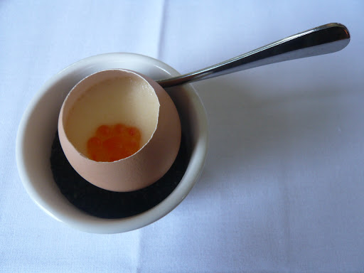 We all had a little entree of chawan mushi (Japanese savoury egg custard) – which I have eaten many a time as it’s a guesthouse standard in Japan, but I’ve never seen it served with salmon roe, in an eggshell, resting on black sesame seeds!