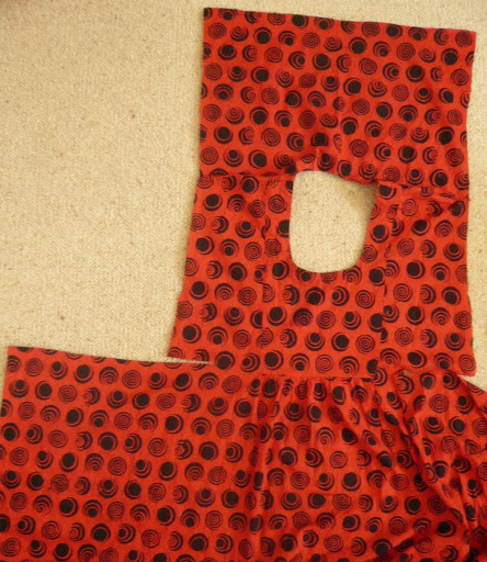 I cut off the sleeve material from the back as well, and also the lower part of the back (ie the skirt section). Here you can see the dress opened out – the top part is the bodice (the hole is for the head of course).