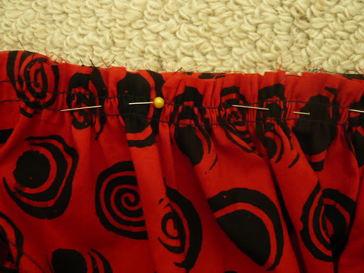 I then sewed the front and back bodice sections together at the sides, and sewed the material I’d cut off the lower part of the back to the sides of the front section to form the skirt. (At this point I’m wishing I had taken a photo of that step as I’m not sure it makes sense without an image. Sorry!) Then I gathered the top edge of the skirt section until it was the same size as the matching edge of the bodice, pinned them together and stitched them. Check an online tutorial if you don’t know how to gather material as it’s one of the essential elements of sewing – basically you create two parallel lines of the longest stitch your sewing machine can do, then pull the two threads and bunch up the material (make sure to pull the two threads on the same side of the material or it won’t work).